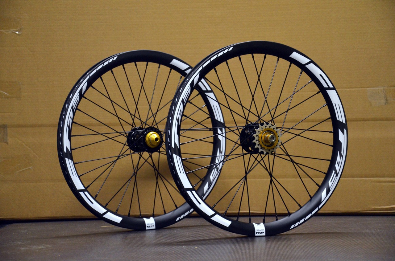 Ultra ISO BMX hubs with special ICE BMX laser engraving paired with the disc-specific ICE TR27X carbon fiber rims. A notable detail in this build is that the hubs were ridden over multiple years. After bearing swap and sprag clutch service they were good to go, and ready to be built with new rims.