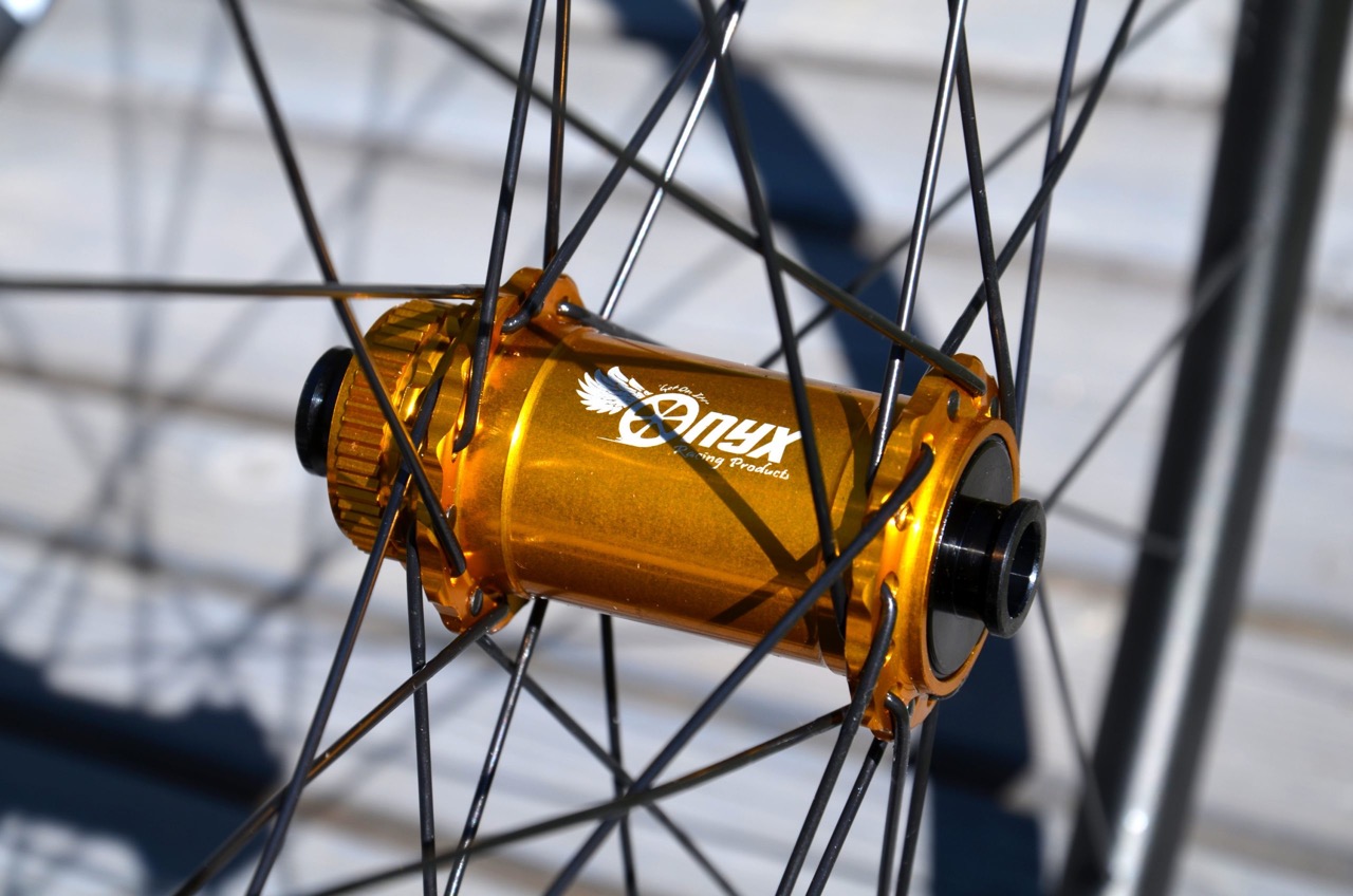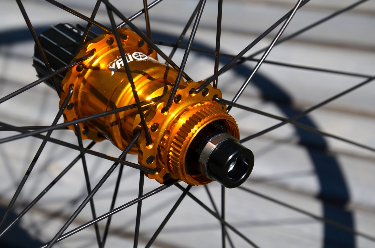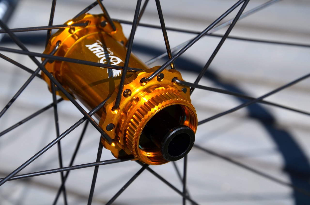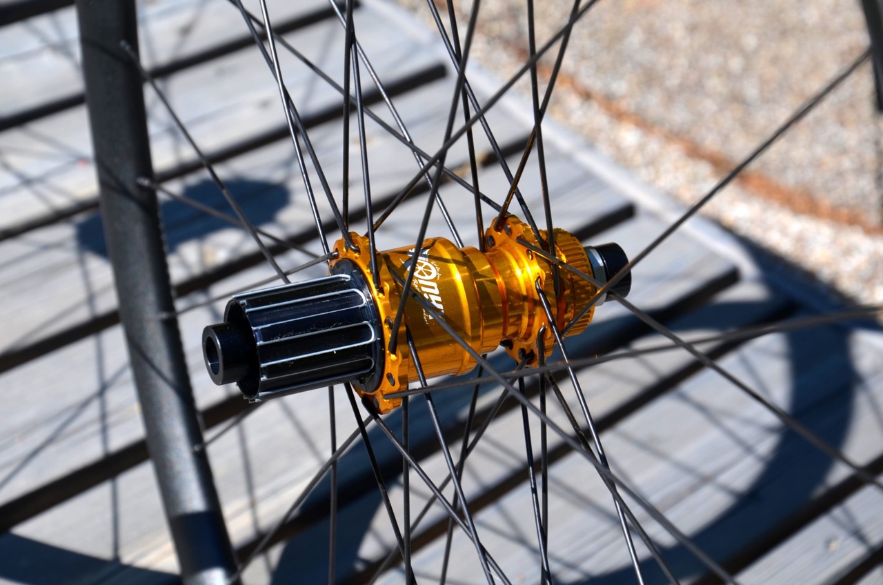 - Vesper Centerlock, 32H, Shimano HG freewheel driver body. Anodized gold shell, anodized black widgets.